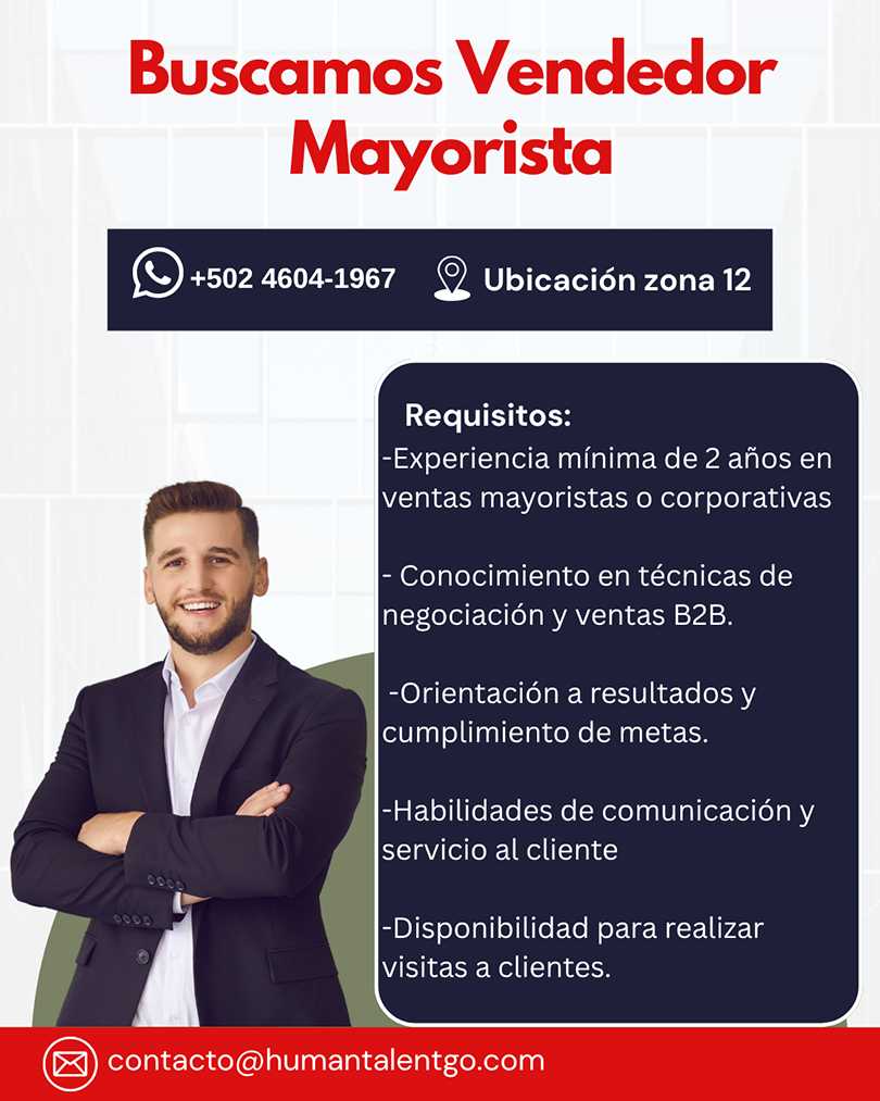- Experiencia: Mínima de 2 años en ventas mayoristas o corporativas.